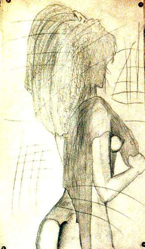 Художник Аси. "Лучистая девушка". 1993. Бумага, уголь, карандаш, пепел от сигарет. 63X38 см (приблизительно). P.S. В подражание стилю Юрия Анненкова.