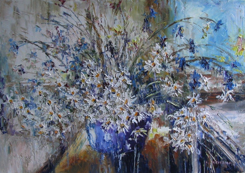 "Васильки и ромашки под дождём"
